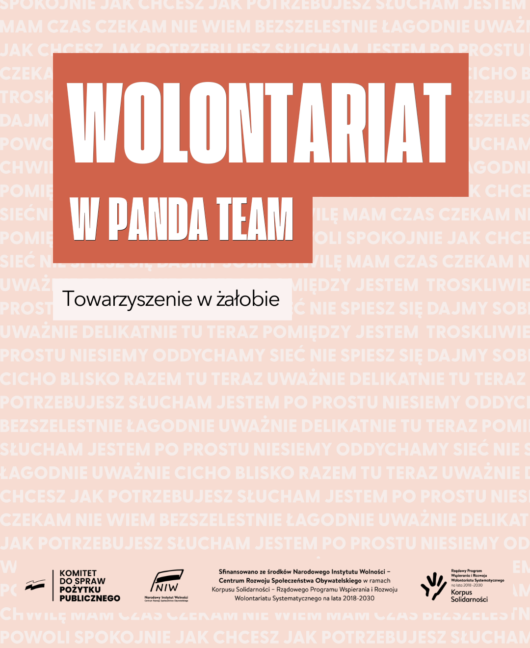 Wolontariuszem w Fundacji Panda Team może zostać każdy, kto chce być częścią działań wspierających osoby w żałobie. Nie trzeba mieć specjalistycznego wykształcenia ani wcześniejszego doświadczenia w pomaganiu. Ważna jest gotowość do relacji, uważność i chęć działania we wspólnych ramach.